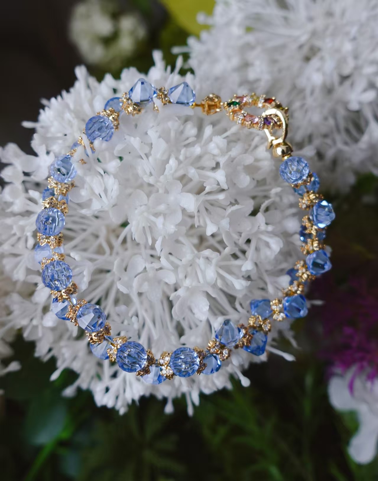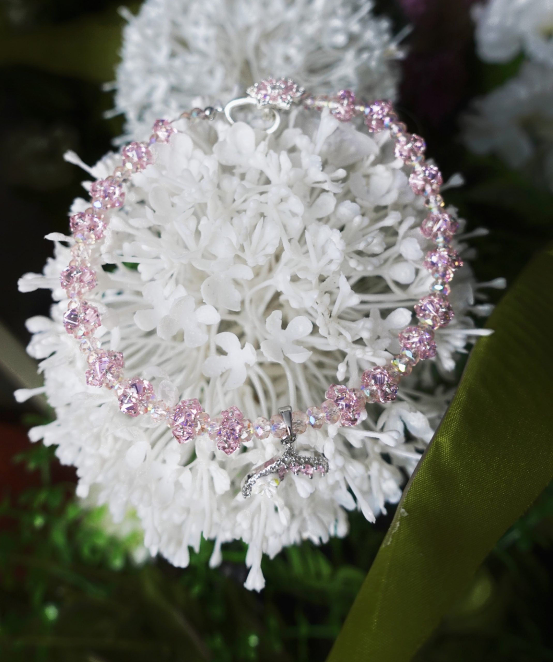 全体にはミユキビーズやスワロフスキー、K9ストーン、パールをひとつずつ手縫いで飾りつけ、光を受けるとキラキラと輝きます。