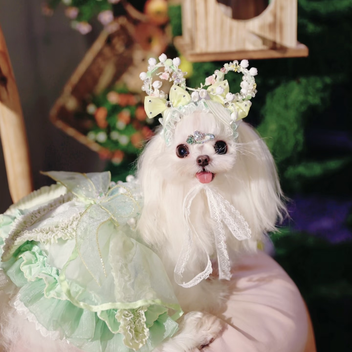 裾は花びらのように重ねたカットで広がり、ふんわりとした可愛いシルエットに。まるでお姫さまのドレスのような、やさしく可憐な一着です。