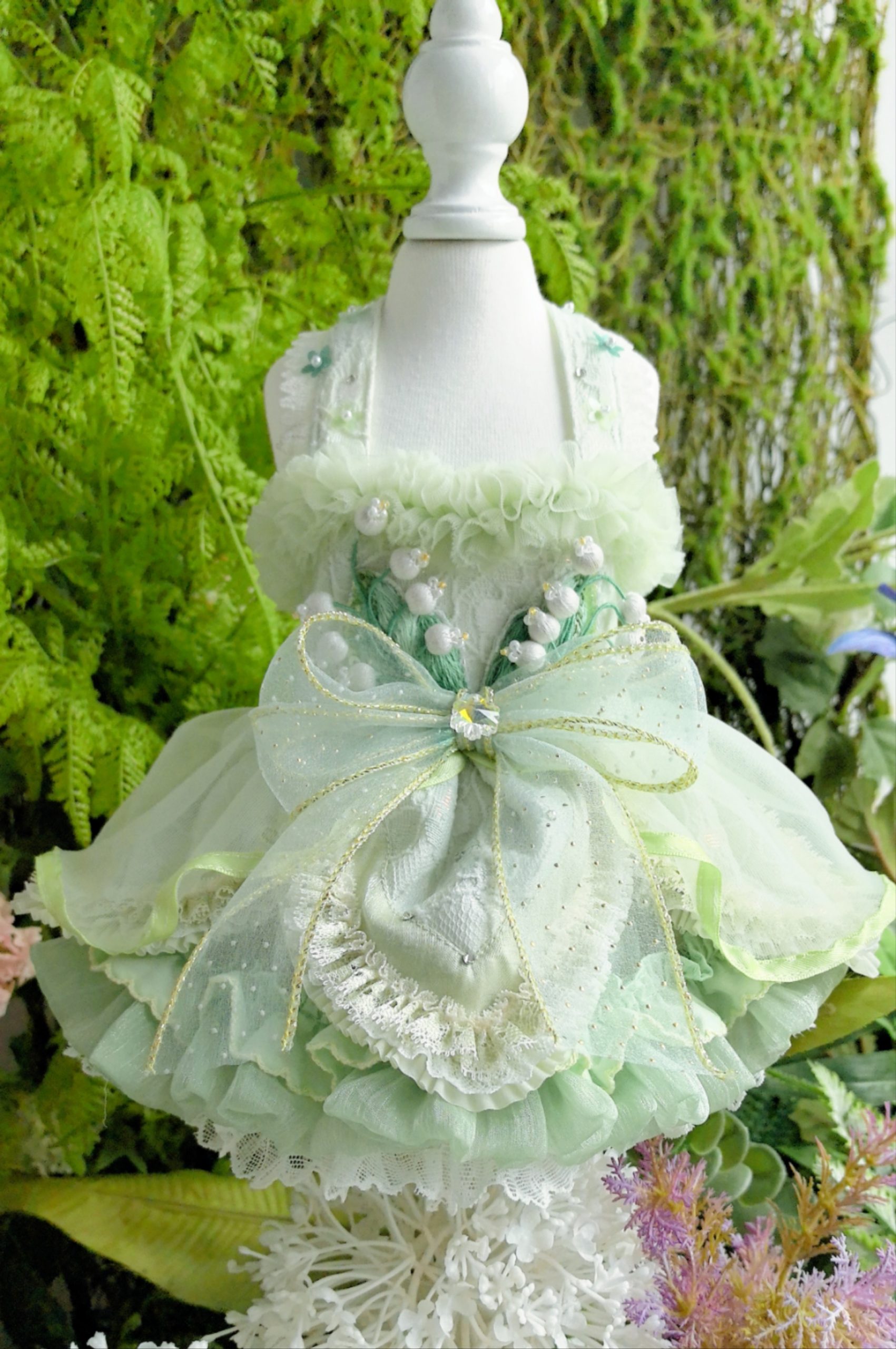 背中全体にはスズランの刺繍を立体的に入れ、パールビーズや刺繍糸で繊細に仕上げました。