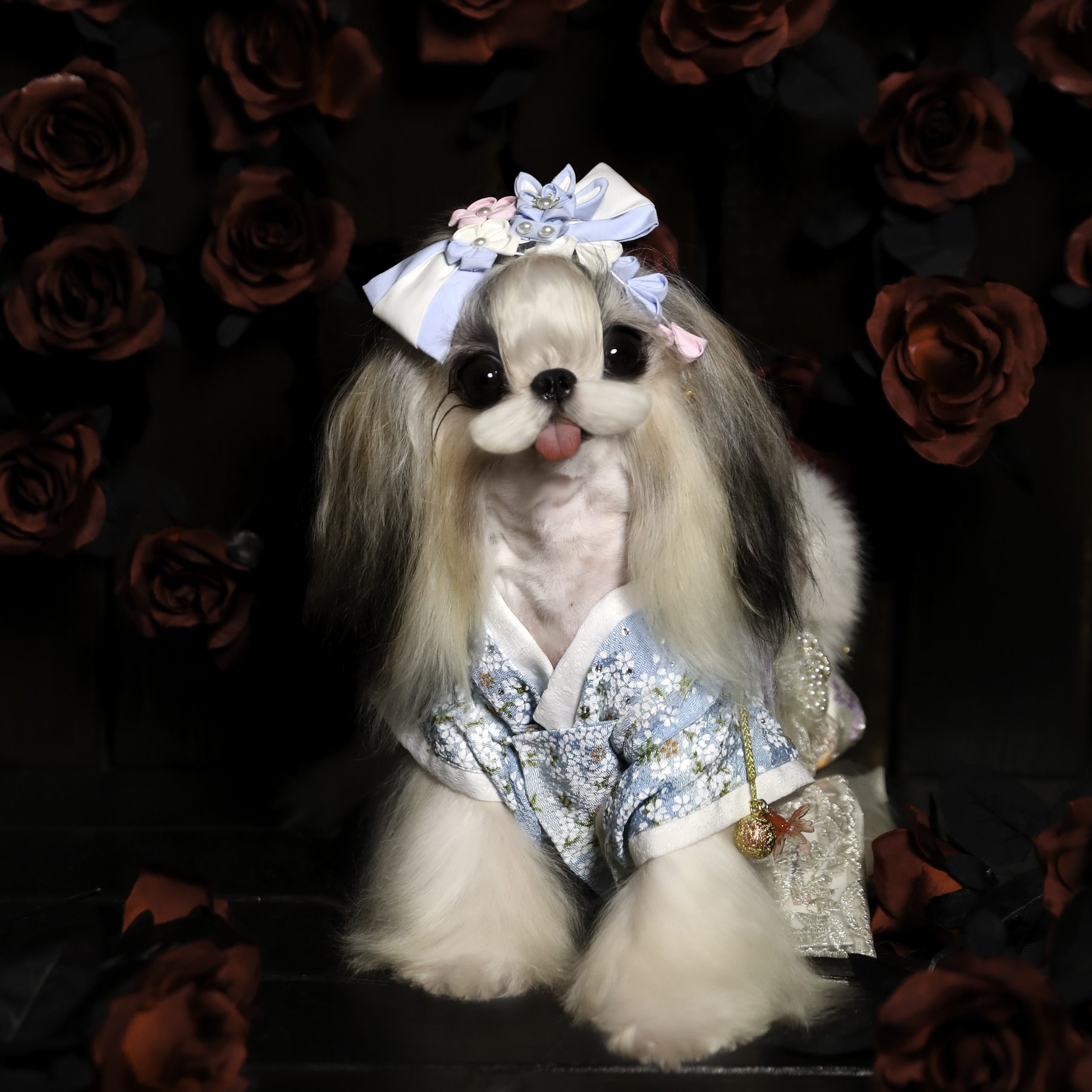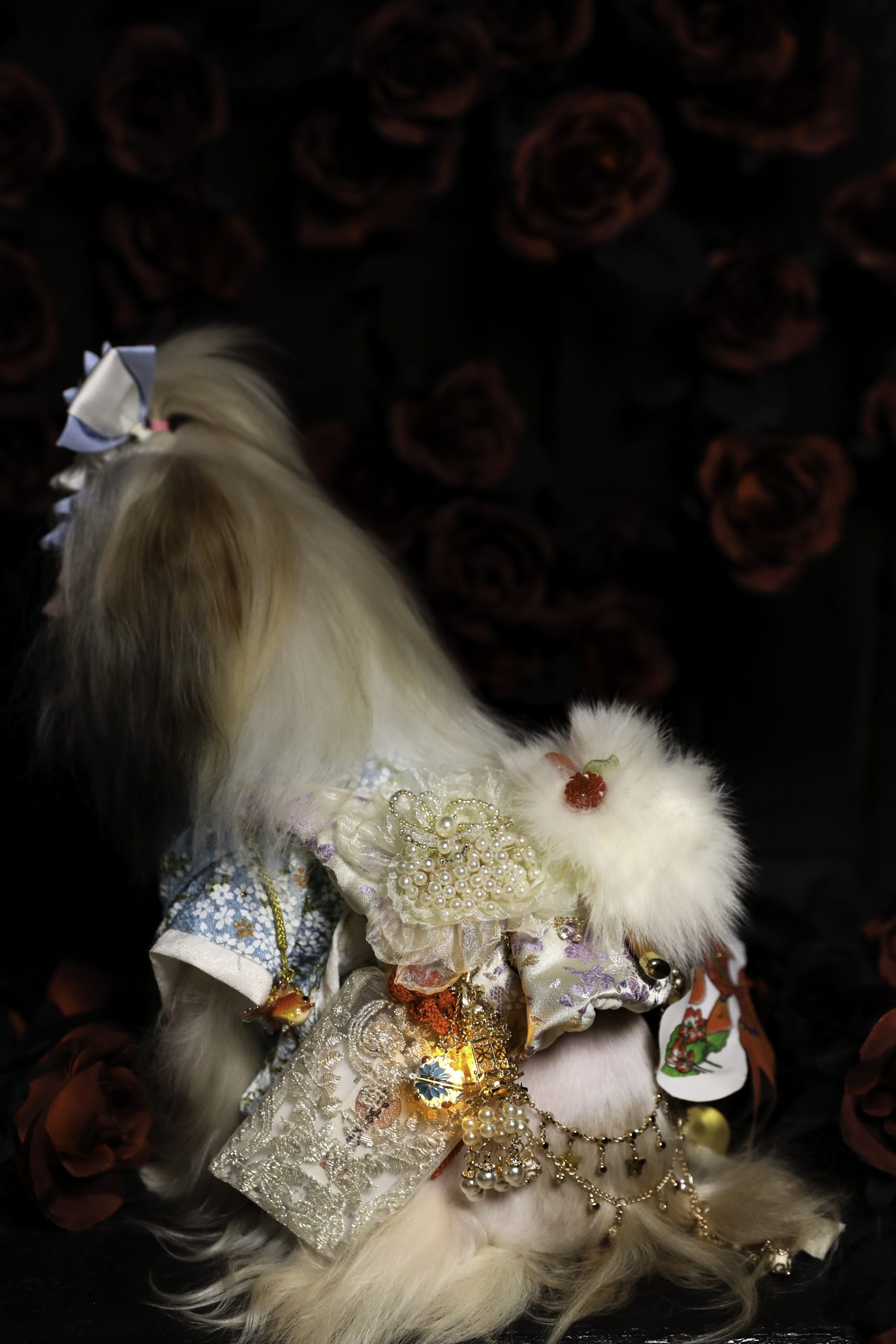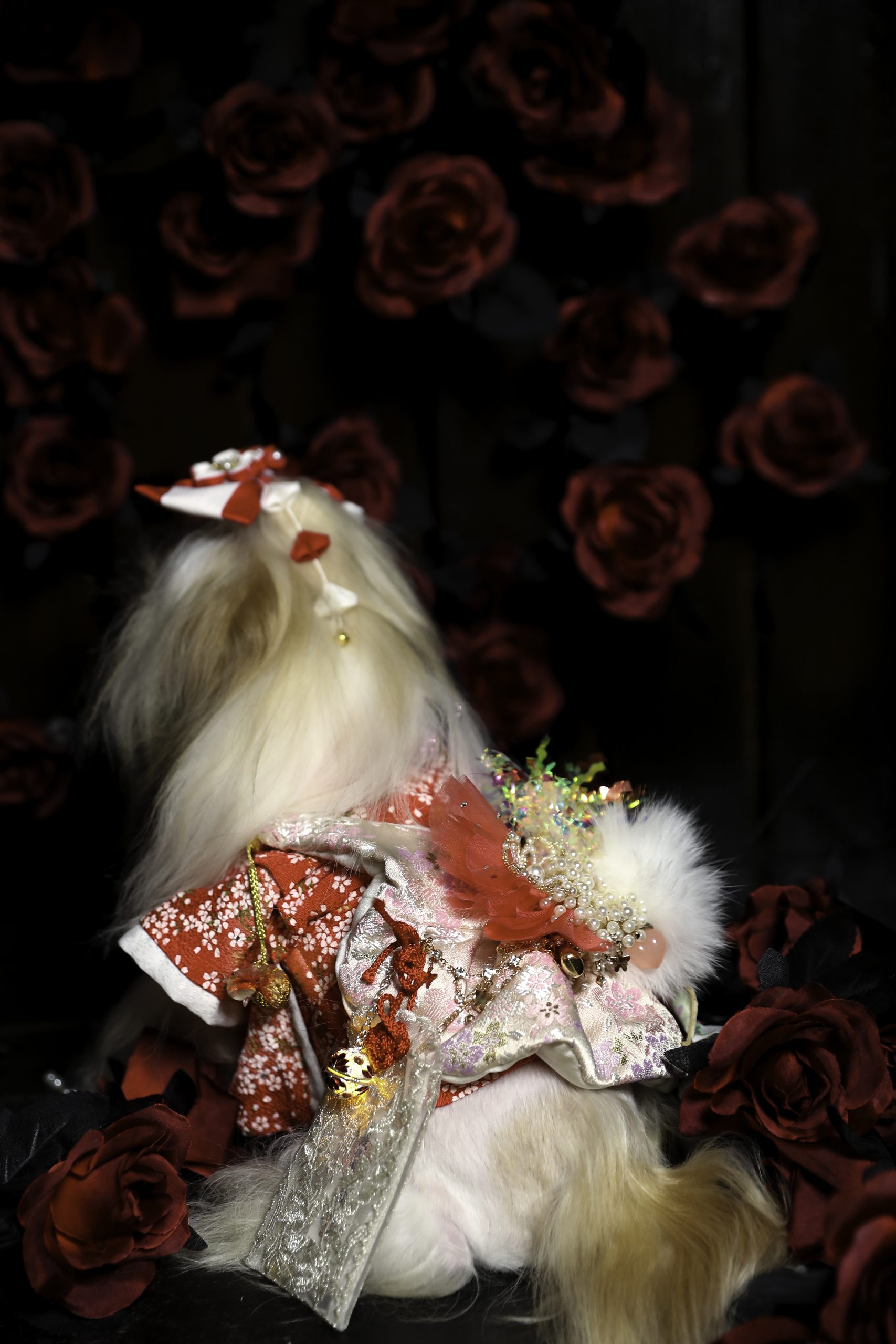 手作業での丹念な仕立て。金魚や福をモチーフにしており、祝福と幸福の意味も込められています。縁起物を各所にあしらい、愛犬の健康と安全をねがっています。